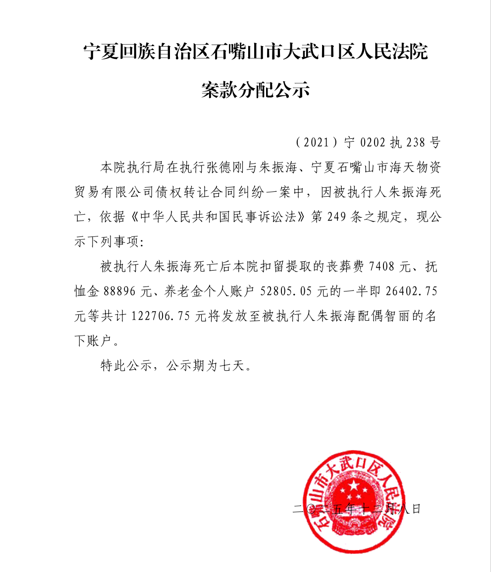 宁夏回族自治区石嘴山市大武口区人民法院案款分配公示