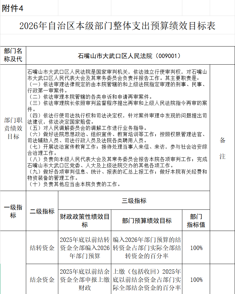 石嘴山市大武口区人民法院2026年整体支出预算绩效目标